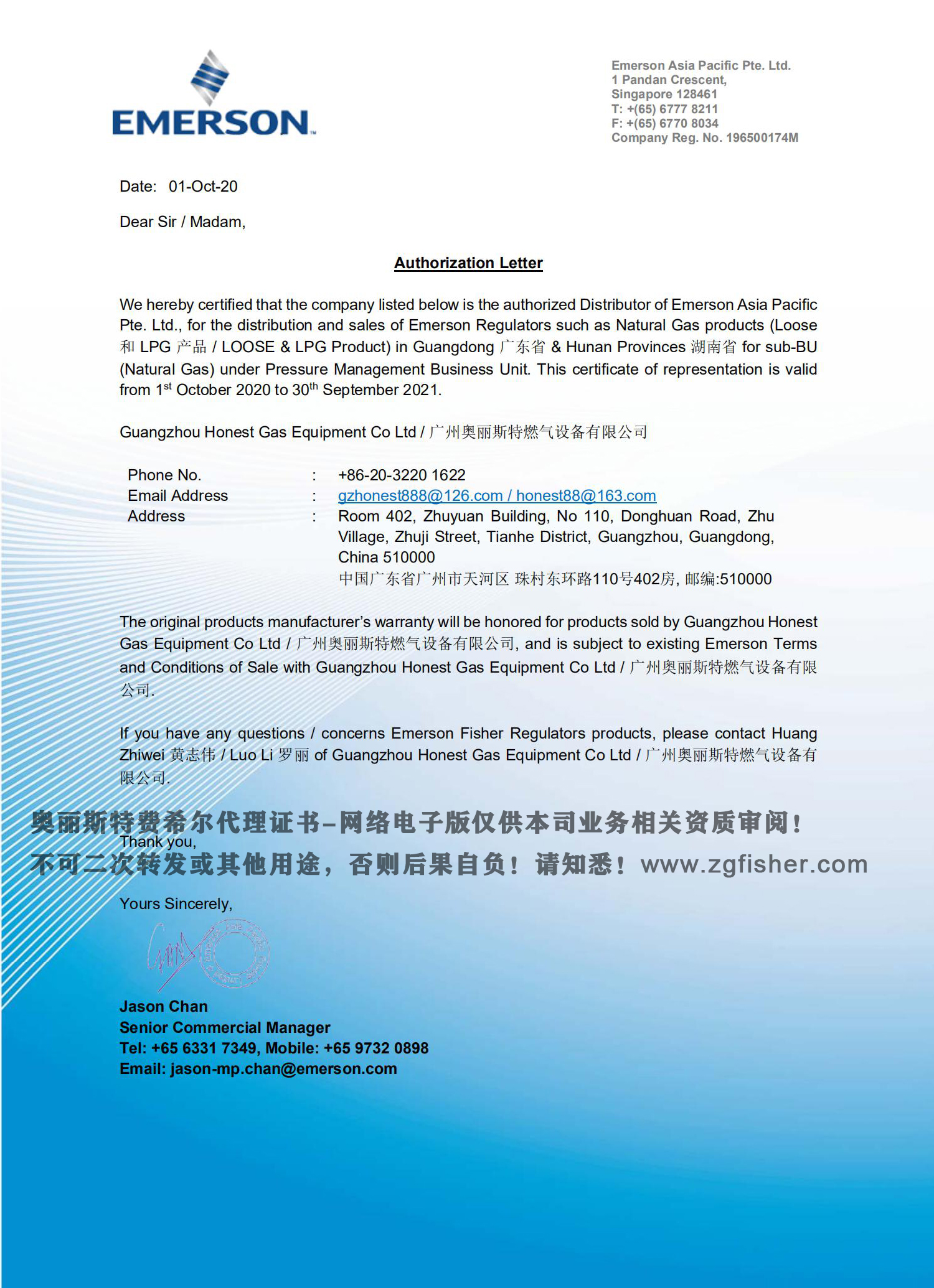 2021年度代理證書EEMERSON艾默生/FISHER費(fèi)希爾