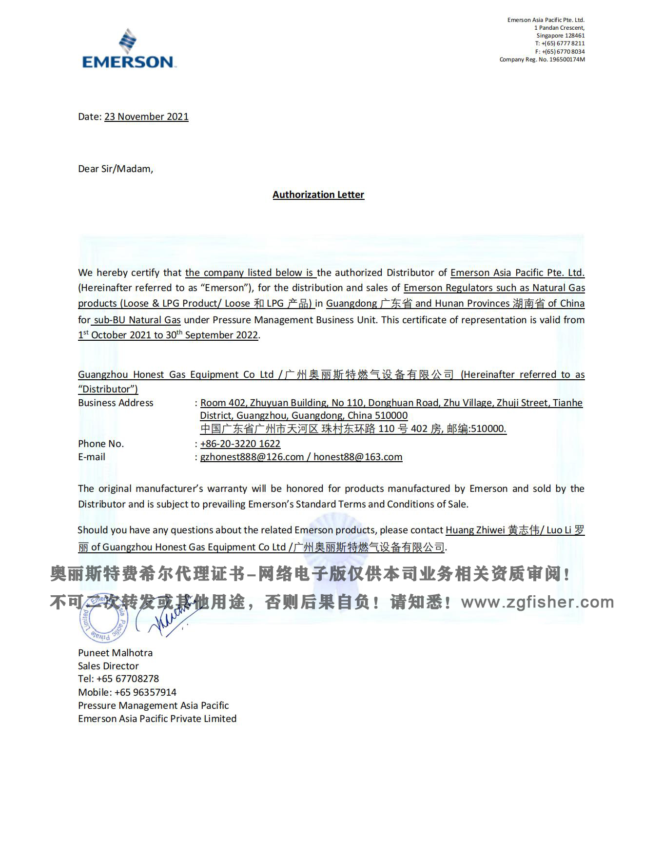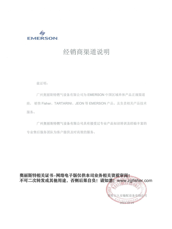 2022年度代理證書EMERSON艾默生/FISHER費(fèi)希爾