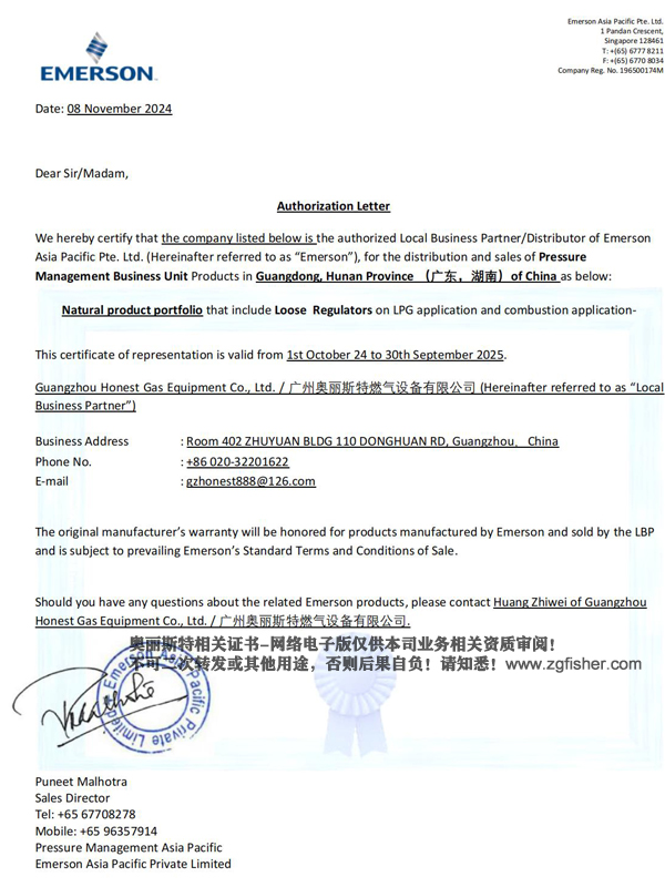 2025年度代理證書EMERSON艾默生/FISHER費(fèi)希爾-LBP
