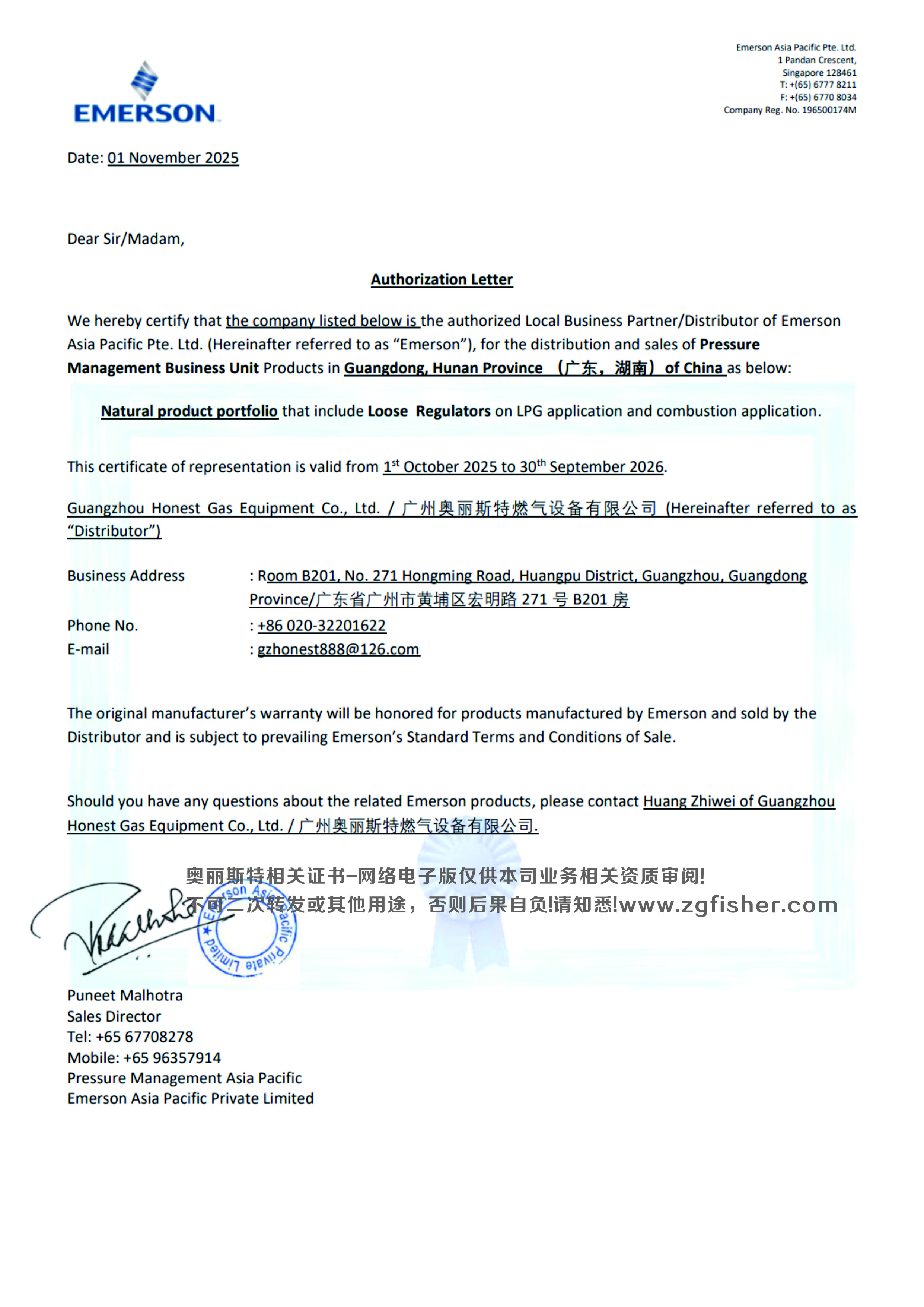 2025年度代理證書EMERSON艾默生/FISHER費(fèi)希爾-LBP