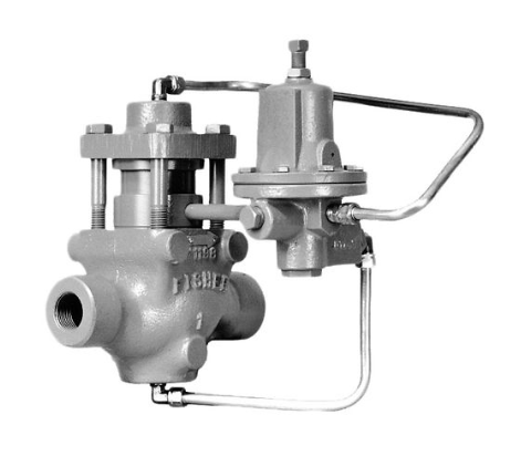 Fisher Type 92W pressure-reducing regulator for liquid service includes either a Type 6492H or a Type 6492L pilot. This reliable, dependable regulator uses time-proven design concepts. Pilot supply pressure is piped from the main valve inlet to the pilot inlet connection. Downstream pressure registers on the main valve pistons through the downstream control line and then on the pilot diaphragm.